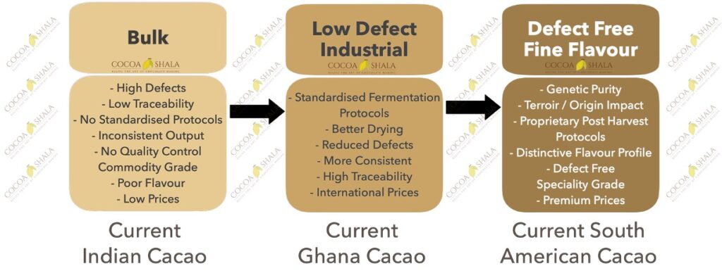 Let us differentiate between Bulk, Low Defect Industrial and fine flavor (specialty) cocoa. Fermented and dried cocoa beans that possess the potential to unlock interesting flavors after roasting, besides the typical cocoa flavor, are often identified as “fine or flavor” cocoa beans. Low Defect Industrial cocoa is cocoa processed in bulk scale with an aim to get a consistent output which is useful as an input the industry. The difference between bulk, Low defect Industrial and fine/flavor cocoa is in the flavor that the beans can lend to the chocolate. Bulk and low defect industrial cocoa do not boast of any delicate flavors and are used to mass produce chocolates. Often, beans with flavor defects pass as bulk cacao. Below is the Cocoashala Indian Cocoa Evolution Model (CICEM):