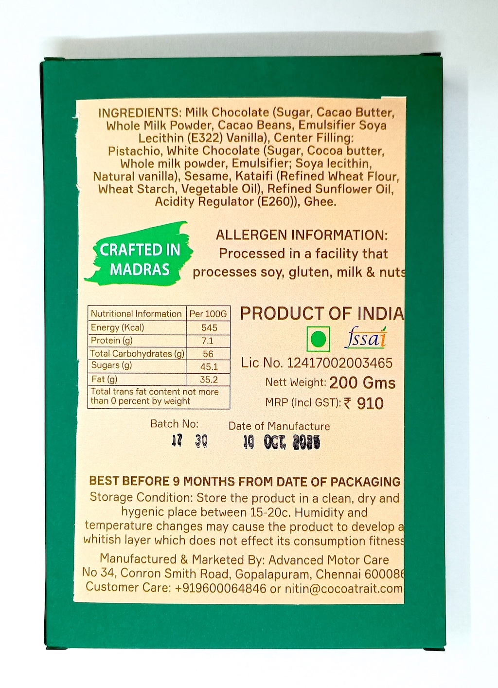 Forget the cliché “Dubai bar.” The Dubai Chocolate by Madras Confectioners is what it should have been. This one is to cater to your sweeter tooth (in comparison to our 49% dark milk couverture chocolate). The 36% milk bar fuses the chocolate with real kataifi—light, crisp strands that shatter and melt into creamy richness. It’s not imitation; it’s elevation. We didn’t just borrow tradition—we perfected it, introducing sweetness in this bar and delivering balance, texture, and depth the originals can’t match. Every bite is proof that luxury belongs in taste, not just spectacle. This is Dubai distilled and reimagined—bolder, sharper, unforgettable. Once you try it, the so-called “authentic” bar will feel like a pale rehearsal. This isn’t chocolate. Experience the new standard.